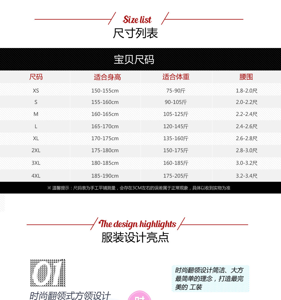 - 本產(chǎn)品共8個(gè)尺碼:XS、S、M、L、XL、2XL、3XL、4XL 覆蓋99.5%的人群 >>>查看尺碼表>