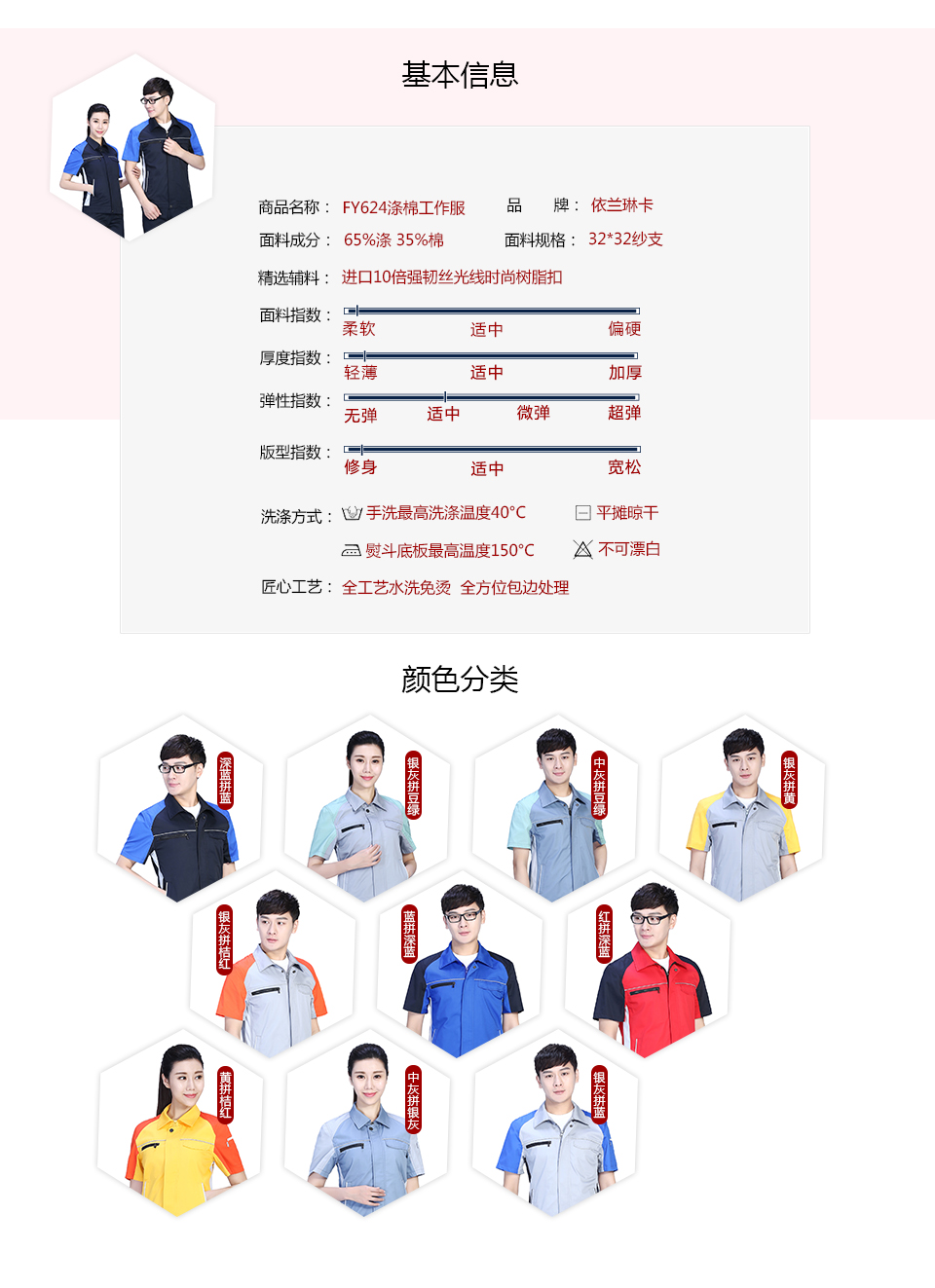 - 標簽:滌棉撞色拼接滌棉細斜短袖工作服FY624
