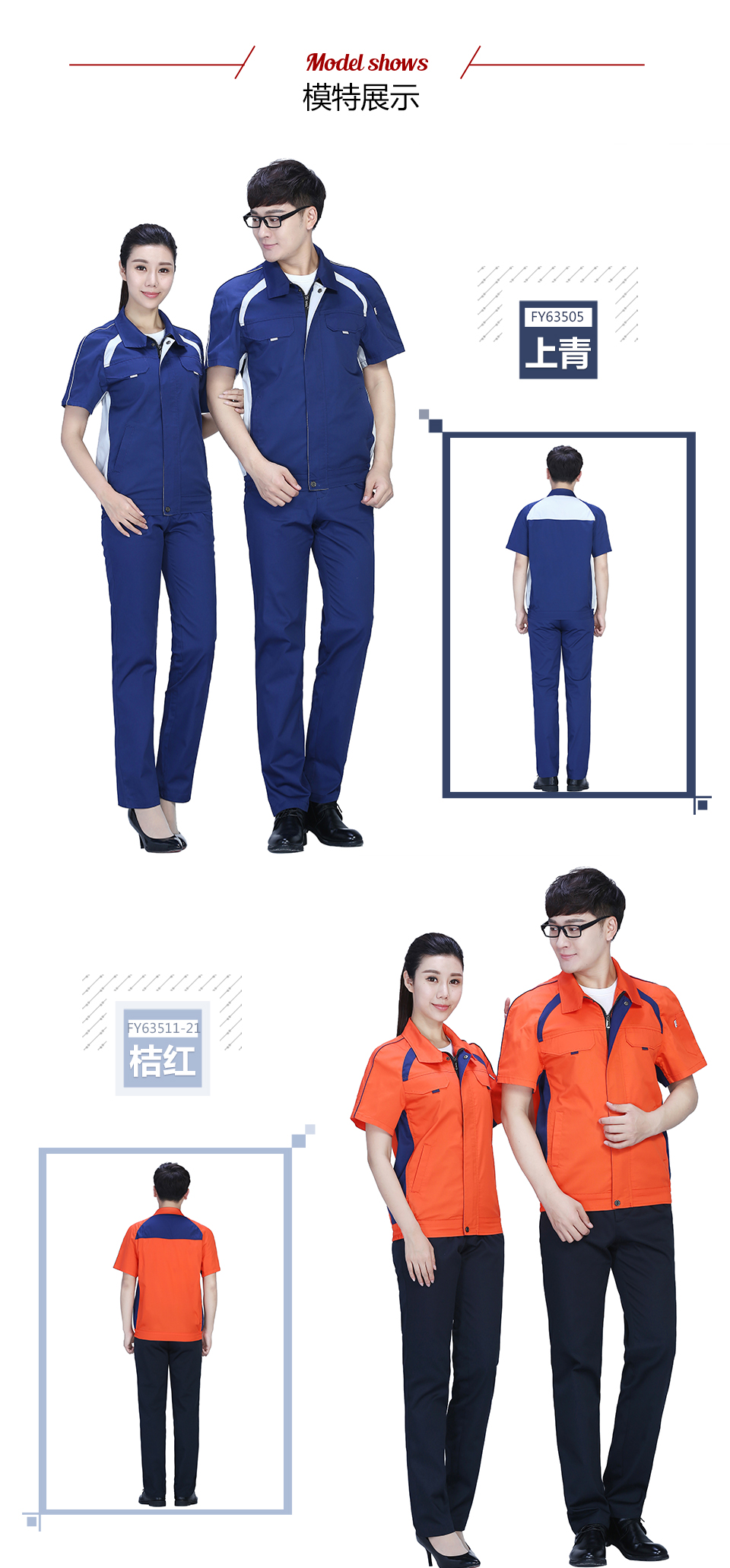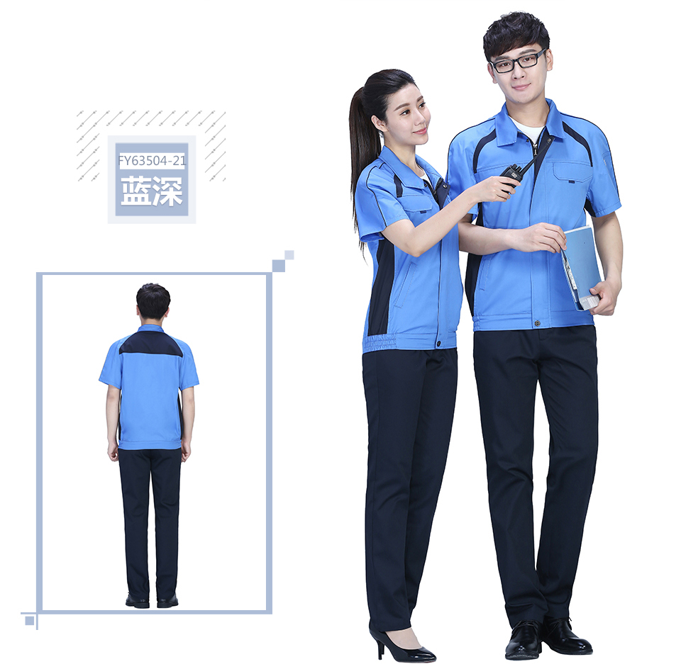 相關深藍色拼接夏季滌棉細斜短袖工作服FY633推薦